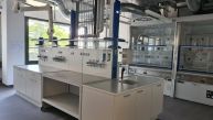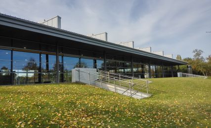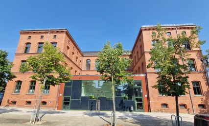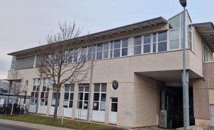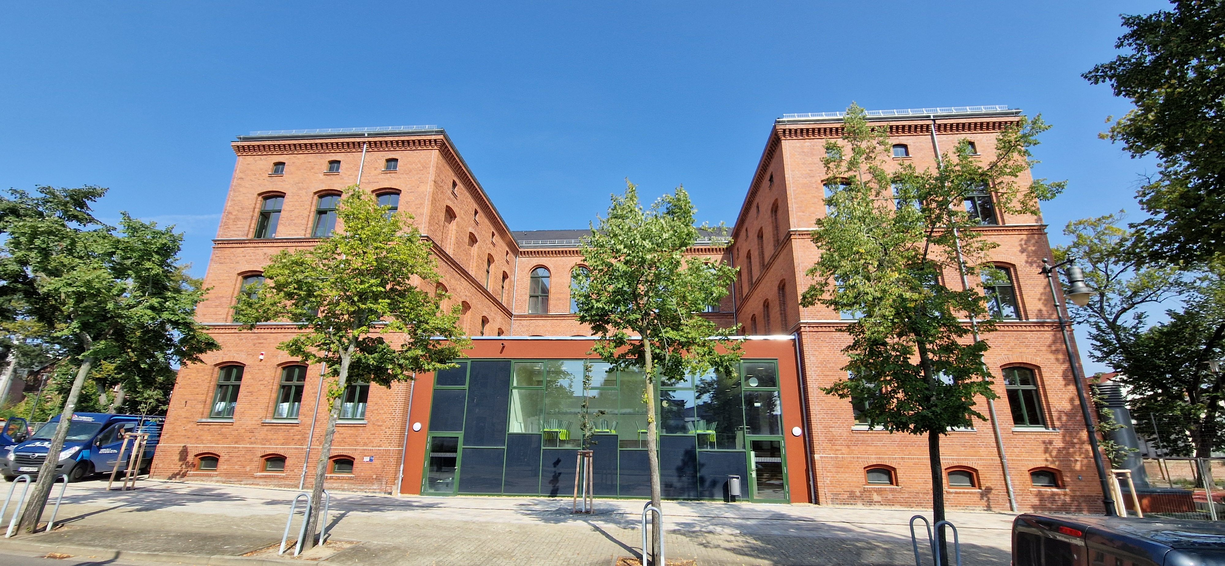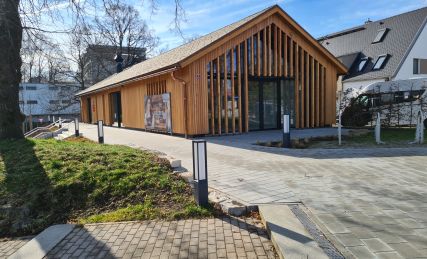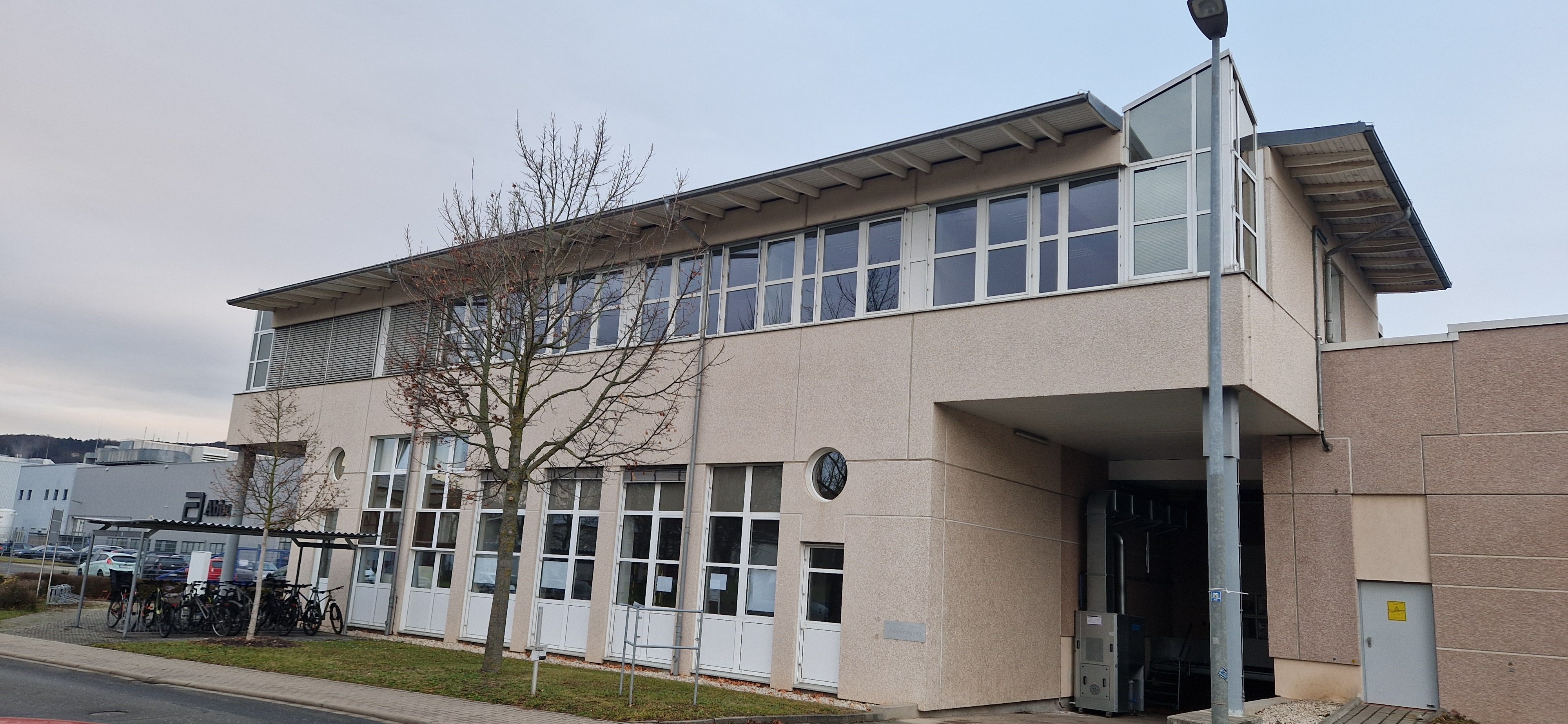 Büro- und Labornutzung aus vorgefertigten Raummodulen mit massivem Erdgeschoss und Treppenhaus